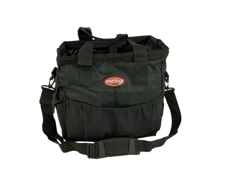 Showman® Nylon Grooming Tote with Mesh Bottom & Handles has multiple pockets that fit most size brushes, grooming supplies and other items.