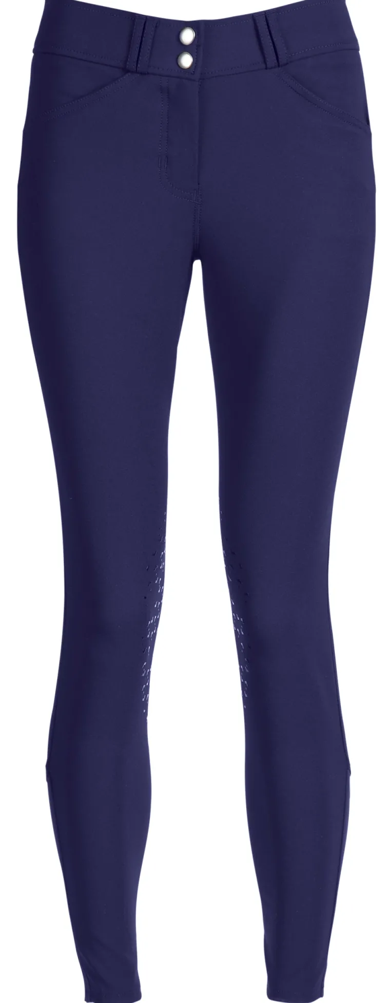Single-layer, high-stretch calf panels provide a custom fit, eliminate bulk inside boots and allow easy on/off. Front slash pockets are made of low-profile stretch material for a no-show appearance on the outside and enhanced comfort on the inside. Flap back pockets on all colors except show tan are low-profile. Silicone knee patches feature a stylish equestrian design that provides flexible grip.