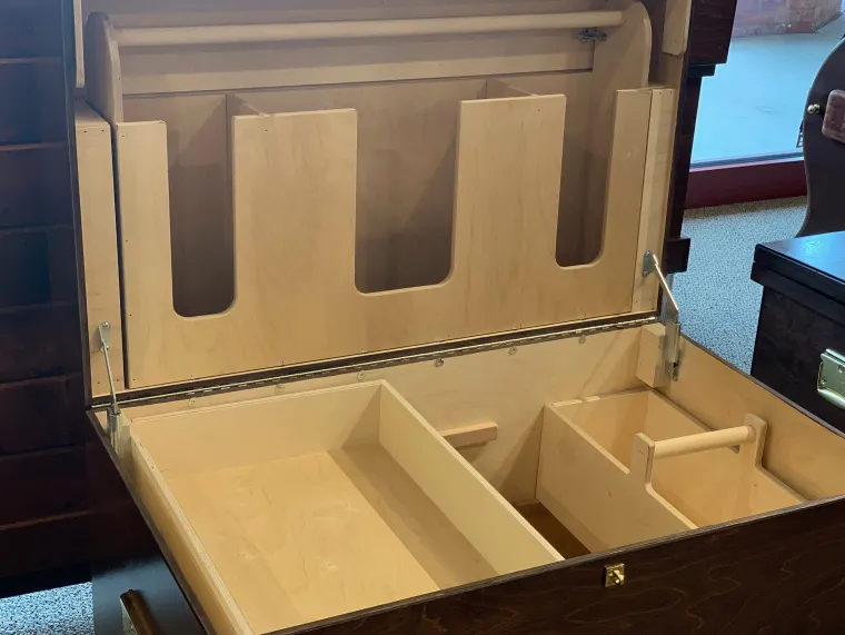 The DS Hardwood Trunk with Bandage Lid includes a grooming tote and tray for complete organization. Well crafted to last for years to come, this trunk has a durable marine-grade finish on the exterior and a sanded interior that’s left natural. For strength, joints are screwed rather than stapled.