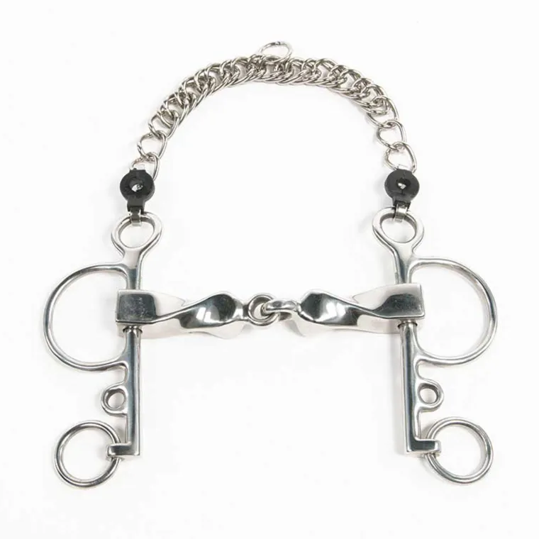 The Metalab Jointed Twisted Pelham is a Level 5 bit made of stainless steel. Features a 5 1/4″ large twisted mouthpiece.