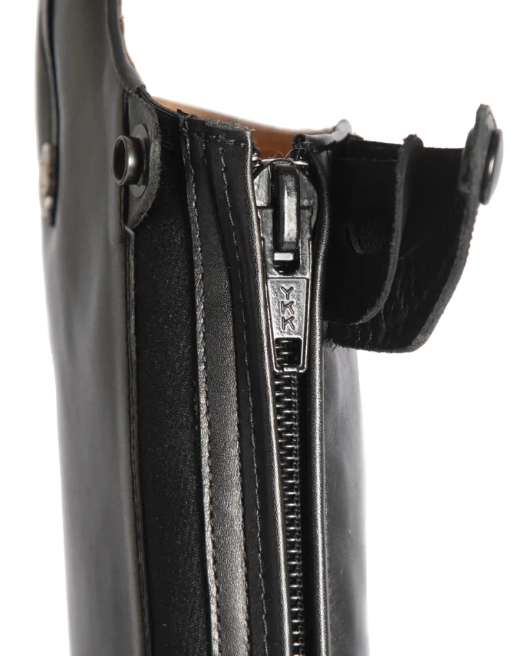 The DSMadison Field Boot is crafted in Portugal by one of the world’s leaders in the creation of equestrian footwear. This exclusive riding boot is made of black, full-grain Spanish leather selected from the best hides and tanned in Portugal. Spanish leather is desirable due to the characteristics cultivated by a mild climate and ethical standards. The result is pliable, durable beautiful leather the breaks in easily.