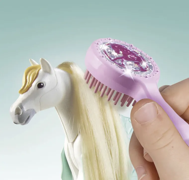 Kids can join Playmobil® Isabella and Lioness at the Washing Station for loads of pre-show fun! The working shower operates with a push of a button to help get Lioness, a Lusitano mare, get clean. Brush the horse’s long mane and tail with the bedazzled hairbrush, then saddle up for a ride.