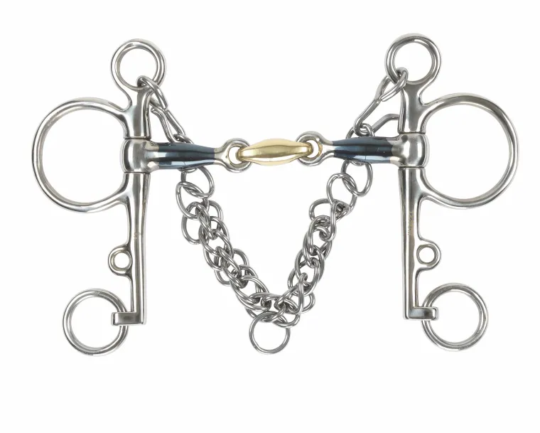 The Blue Sweet Iron Pelham Bit with Brass Lozenge has a design often chosen to assist with control. The lozenge distributes pressure over both the tongue and bars of the mouth and avoids the nutcracker effect of a single-jointed bit.
