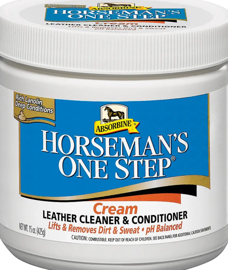Horseman’s One Step™ contains three cleaning agents to remove dirt, sweat and salt from leather. It penetrates leather to protect against drying and cracking and leaves behind a satin sheen. This unique lanolin formula leaves no greasy residue and allows leather to breathe. 15 ounces.
