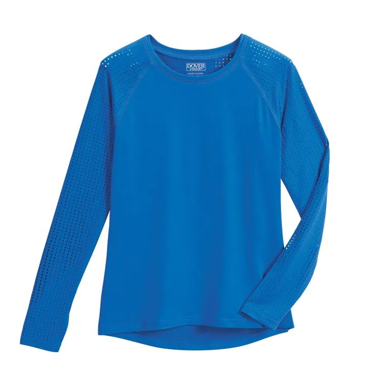 The Stride™Girls’ Long Sleeve Tech Top offers an athletic fit in stretchy performance fabric. Technical wicking fibers work to keep skin dry, while a perforated back panel and sleeves enhance breathability in areas likely to perspire most.
