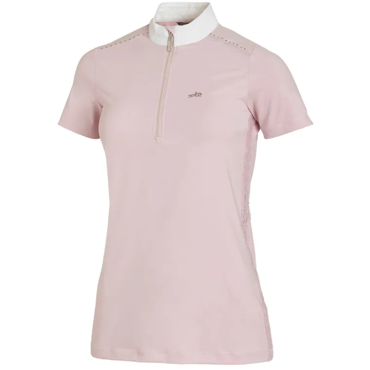 Compete in ultra-feminine style with the Schockemöhle Coco Short Sleeve Show Shirt. Made of high-stretch fabric for freedom of motion, it sparkles with crystals on the front and back shoulder yoke seams and a rhinestone logo on the chest. Lace along the side seams creates ventilation and a pretty detail. Concealed zip placket offers a clean look under a show coat.