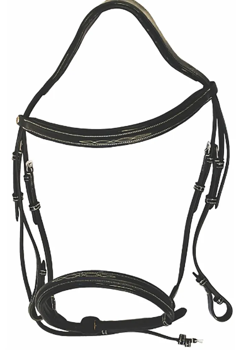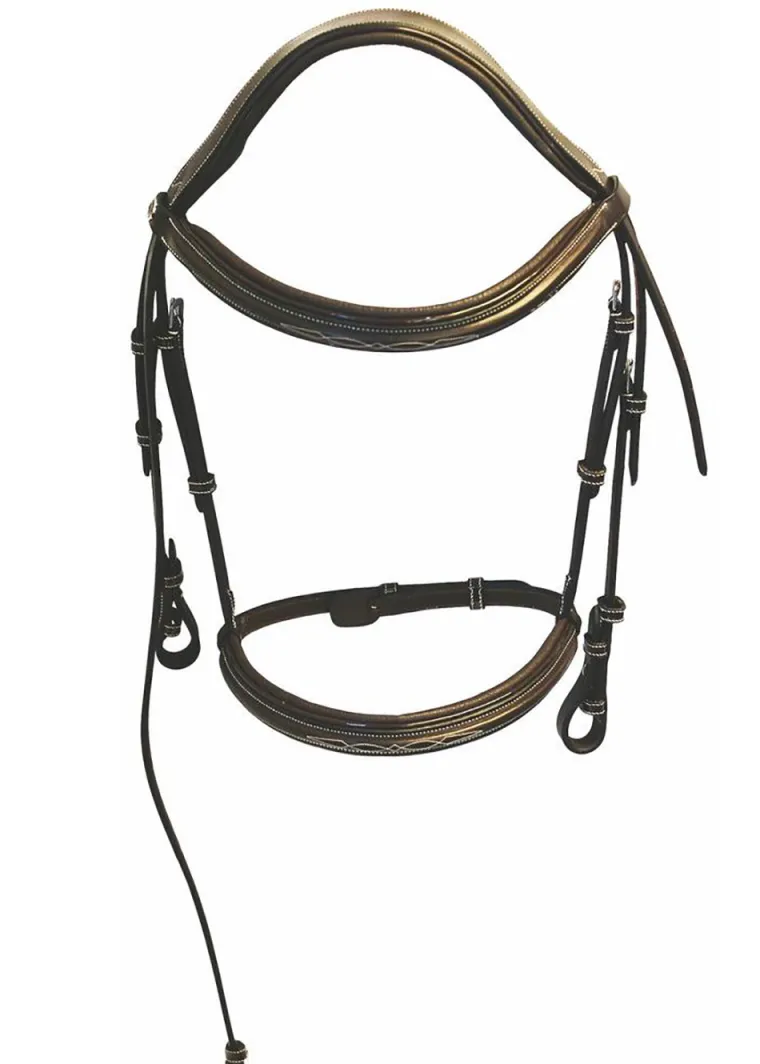 The HDR Pro MonoCrown Bridle features a single, well-padded crown that is cut back at the ears and slightly wider over the poll for optimal weight bearing. A subtle hint of self-colored patent leather piping enhances the padded, fancy-stitched brow, noseband and crown, and all keepers are patent leather. Made of quality leather with stainless steel hardware throughout, this elegant bridle has 5/8″ cheeks and hook stud ends. Matching flat laced reins are included.