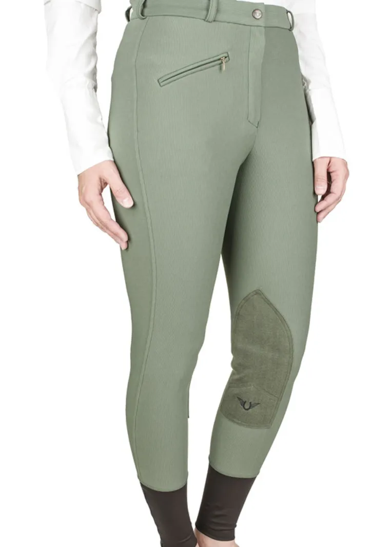 You’ll appreciate the TuffRider® Breechfor its durability, easy care and budget-friendly price! Long-wearing stretch ribbed fabric offers comfort for riding; UltraGripp™ knee patches provide grip. This classic ladies’ breech is styled with a regular rise, front-zip closure, flattering slant zip pocket and stretchy sock bottoms.