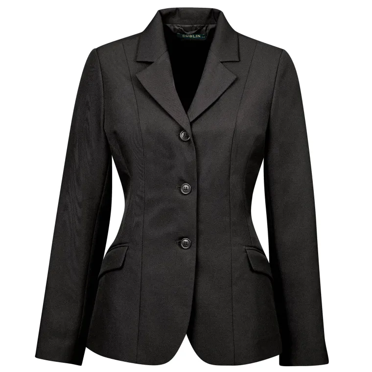 Young competitors look polished and classic in the Dublin® Kids’ Ashby Show Jacket III. Made of easy-care poly twill fabric and fully lined, it enhances the riding silhouette with flattering princess seams and shoulder pads. Timeless styling includes three-button front, double-vented back and two front flap pockets. Hanger and garment bag included.