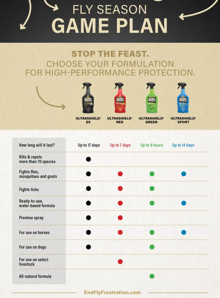 Absorbine® UltraShield® Green Natural Fly Repellent is a unique, eco-friendly formula that controls biting flies, mosquitoes, gnats and ticks for up to eight hours. Made for use on horses, ponies, foals and dogs, this fly spray contains seven essential oils that are known for their repellent qualities. The fresh botanical scent makes it pleasant to use, and it leaves coats shiny.