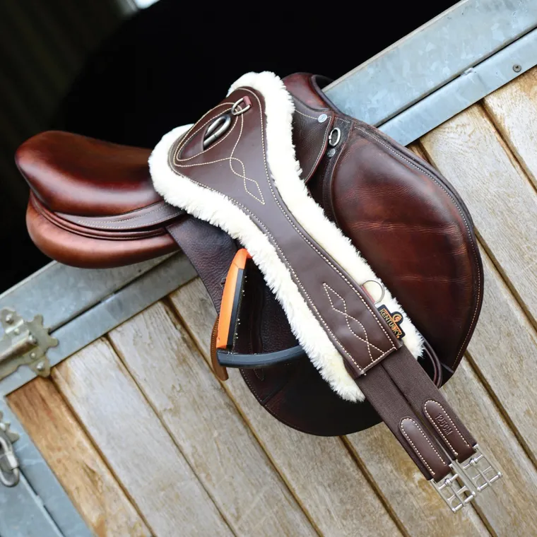 The manmade leather is durable, easy to maintain and resists dirt, sweat and water. It does not change color and withstands heavy use. Hook-and-loop on the inside aspect attaches this ergonomic girth to an artificial sheepskin liner, which cushions the skin and allows airflow.