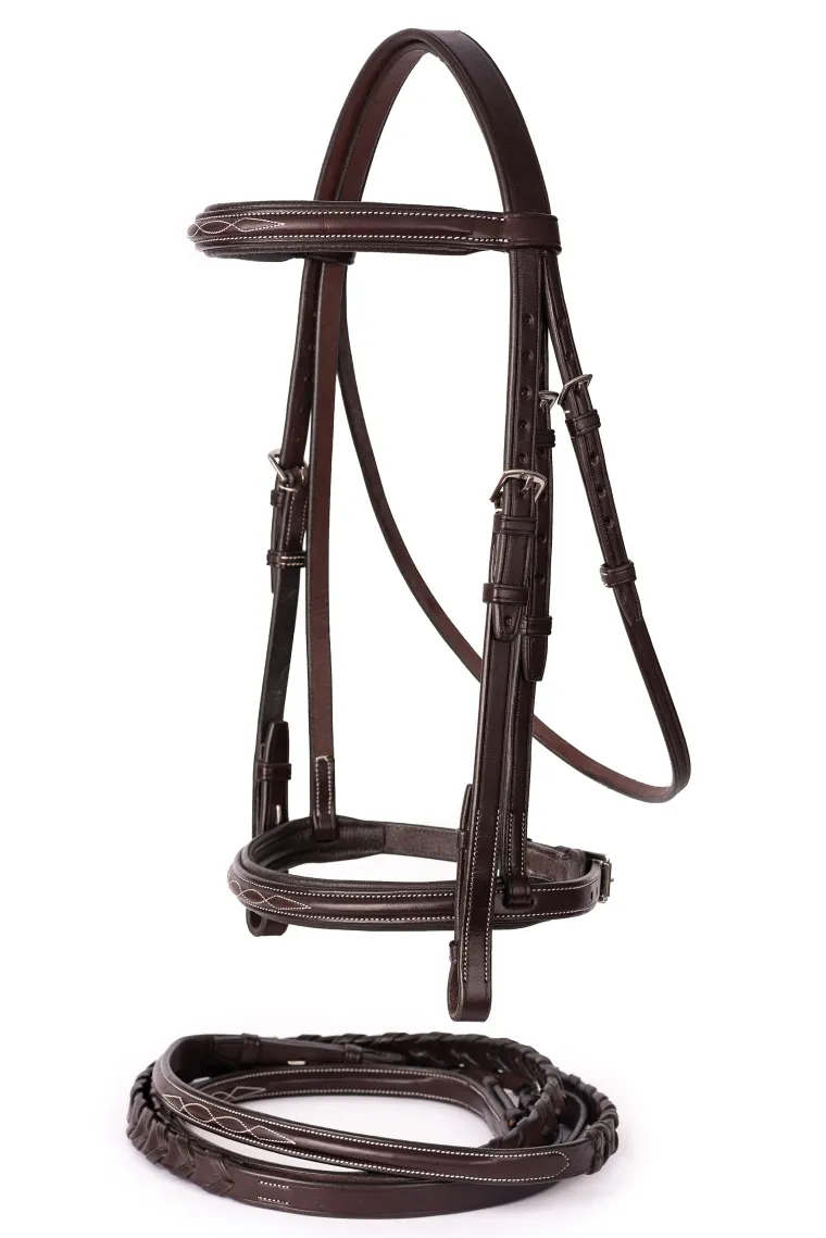 Fancy white stitching accents raised paneling on the browband, noseband and rein fronts. Padded for horse comfort in the all the right spots, it is fitted with durable stainless steel hardware, including hook stud closures.