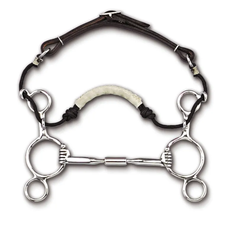 The 6″ stainless steel 2-ring combination bit is a hybrid of a ring bit, shank bit, and hackamore and uses five different pressure points to disperse rein pressure. Because the noseband and chin strap are connected through the purchase, when the reins are engaged, the horse first feels nose, chin and poll pressure before he feels the mouthpiece.