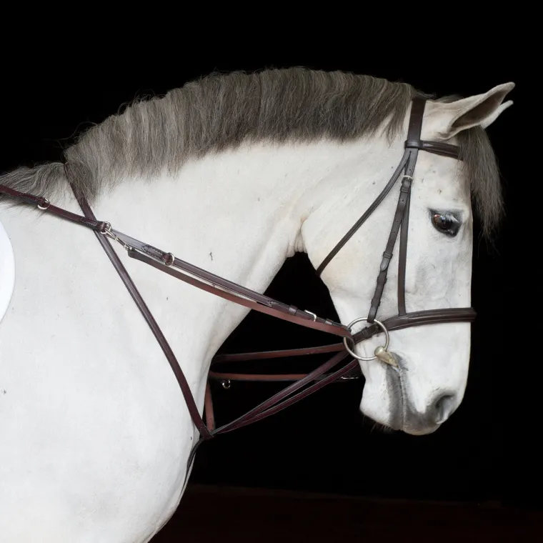 The German Martingale Rein Set by Tory Leather Company helps teach flexion and head set. Made in the USA from high-quality American, vegetable-tanned leather, it offers traditional martingale action, but the longer fork has a snap-on end to pass through bit and attach to one of three d-rings on the rein. Leather reins are included.