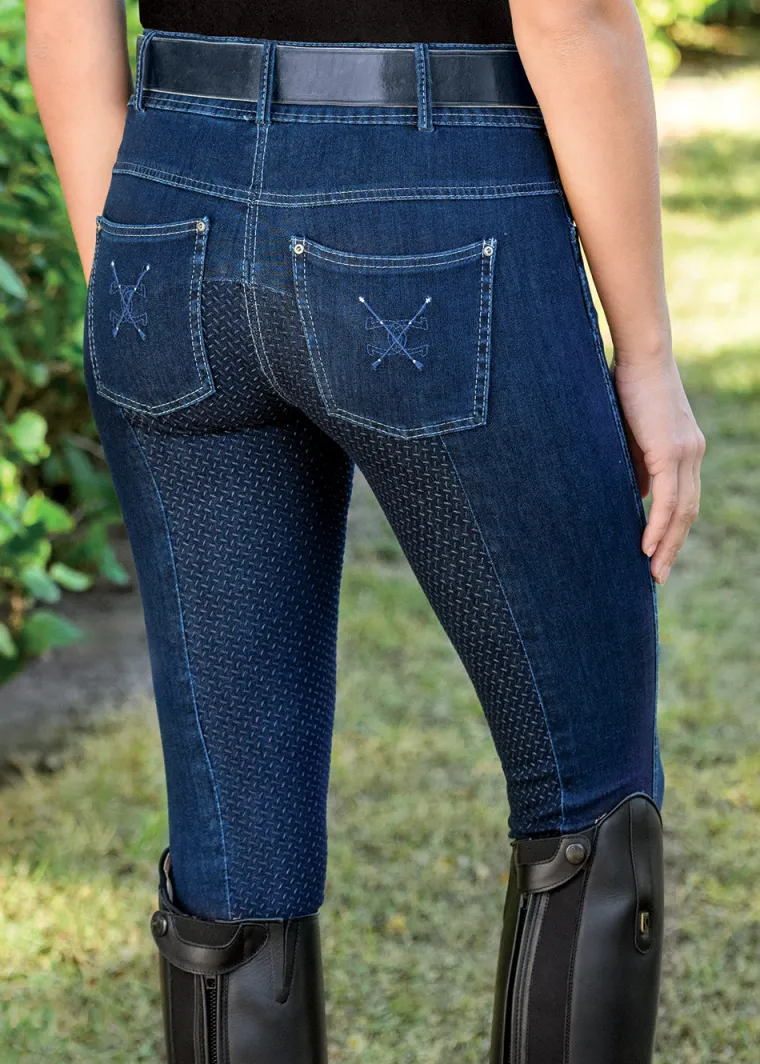 The Goode Rider™ Vogue Jean Full-Seat Breech has a soft, velvety touch and super stretch. It’s made from a newly developed fabric composed of specially twisted yarns that create its distinctively soft hand. Incredibly flattering with its mid-rise fit, the Vogue Jean breech boasts subtle embroidered whip detail on the back pockets. Embossed whips on the front snaps carry on this theme. Good Rider’s Stretch Custom Fit Waistband™ contours to your shape to provide added comfort and coverage for riding. A silicone full seat provides great grip. Extended sizes available.