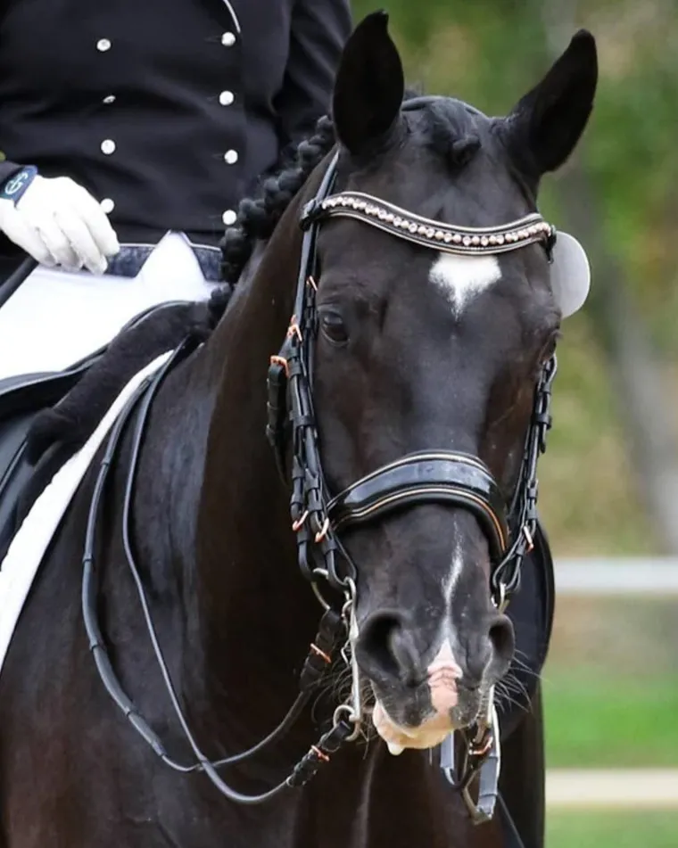 Thebest selling Halter Ego Aurelia Rose Gold Black Patent Double Bridle is simply stunning and perfect for rose gold fanatics!The black patent anatomical, crank noseband measures 2″ at the widest point. Plush black Nappa leather padding, flat leather and the padded, anatomical crownpiece alleviates poll pressure and provides ultimate comfort. Buckle cheekpieces with adjustable throat latch on both sides. Metallic Rose gold piping on noseband and browband, rose gold buckles and hardware, alternating rose gold crystal pearl cabochons and vintage rose crystal browband with rose gold piping and cupchain make this bridle exceptionally beautiful. This bridle comes with two sets of reins 56″ long; a curb rein with rose gold hardware, and a snaffle rein with a thin rubber grp lining androse gold hardware.