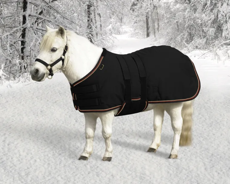 The waterproof and breathable Kensington™ Signature Mini Medium-WeightTurnout Blanket keeps your miniature horse comfortable. Insulated with 180 grams of hollow fiberfill, it is perfect for chilly days. The 1200 denier ripstop Teflon®-coated outer shell deflects weather, and the 70 denier nylon lining is smooth against your horse’s hair.