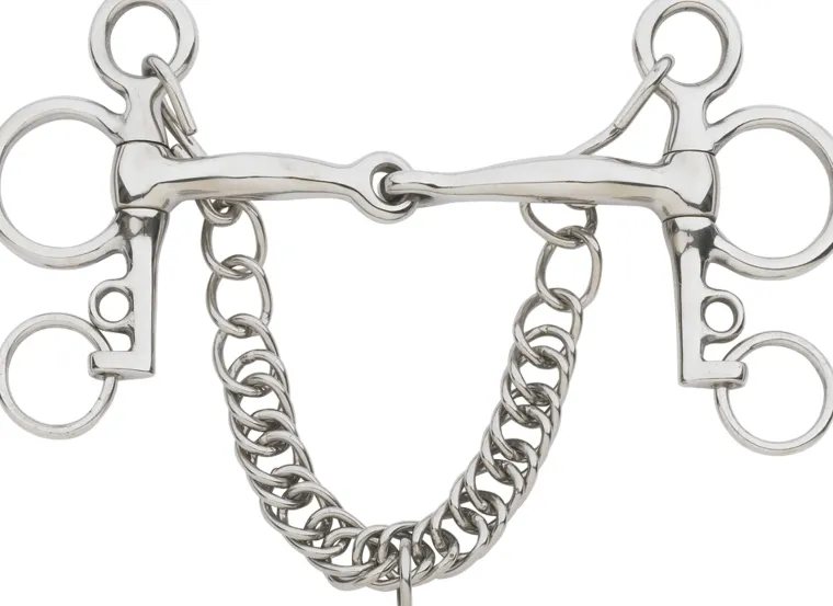 The Suffolk™ Jointed Tom Thumb Pelham bit has 4″ cheeks. Includes curb chain.