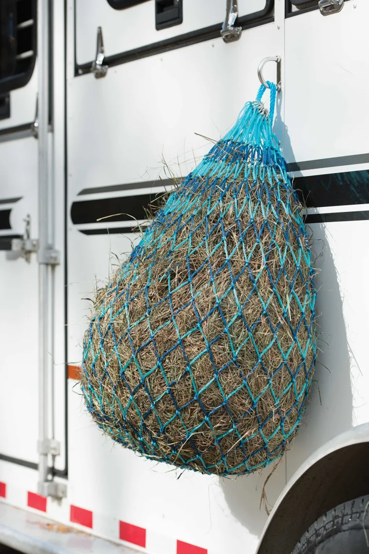 The Shires Deluxe Hay Net in extra-strong mesh holds 10 flakes (approximately 40 pounds). Metal rings at the top help this large hay net stay open for filling. A single large metal ring at the base provides support. Synthetic mesh has 2″ feeding holes to reduce hay waste and slow your horse’s rate of consumption so hay lasts longer.