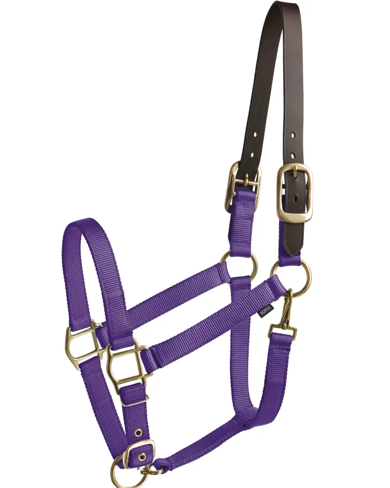 Suffolk™ Heavy Nylon Halter with Breakaway Crown delivers reliable, long-lasting service. The replaceable leather crown is intended to break and free your horse if the halter gets caught on an object. In triple-layer 1″ wide heavy-duty nylon webbing with sturdy brass hardware.