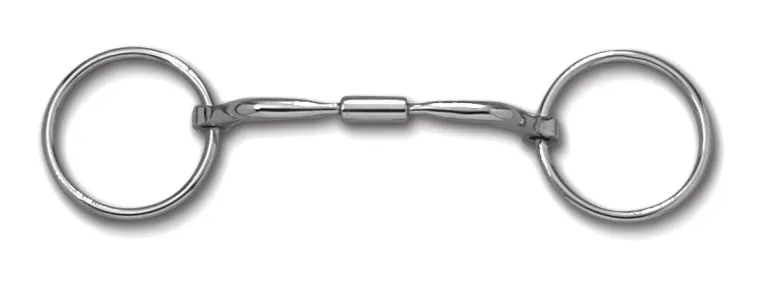 The Myler® Loose Ring Comfort Snaffle MB 02 is a Level 1 loose ring bit intended for horses beginning training. The free-rotating barrel uses mostly tongue pressure and collapses onto the bars. The curved mouthpiece permits the horse to swallow more freely and distributes pressure evenly.Independent Side Movement™ allows the rider to isolate one side of the bit for bending, balancing or lifting a shoulder. Stainless steel with copper inlay. Dressage legal for both USEF and FEI.